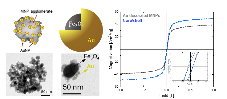 Magnetite (Fe3O4) MNPs have been synthesised while electrochemical sensing is required. To make them electrically conductive, they are transformed into hybrid particles in a second step. These Janus MNPs have a gold contact on one side and a magnetic part on the other.