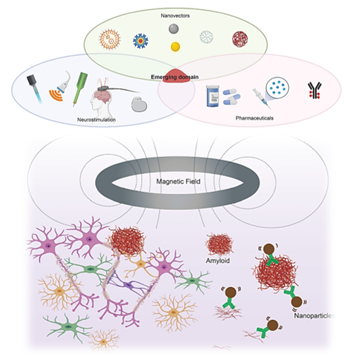 Figure 1 Top: Neurotechnologies based on magnetic fields and magnetic nanoparticles for AD. Bottom: Potential clinical integration can include nanoparticles as both a diagnostic tool and potential therapeutic modality.7